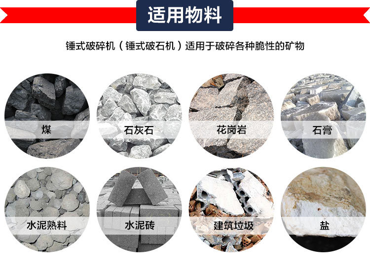 被破碎物料為煤、鹽、白堊、石膏、磚瓦、石灰石等。還用于破碎纖維結構、彈性和韌性較強的碎木頭、紙張或破碎石棉水泥的廢料 以 回收石棉纖維等等。此外,錘式破碎機不僅可用于破碎生產線,制砂生產線,也可在選礦生產線中替代圓錐式破碎機。
